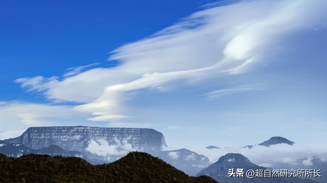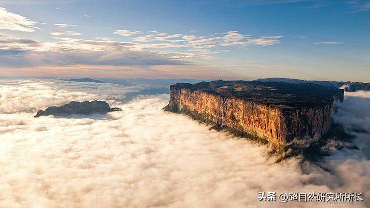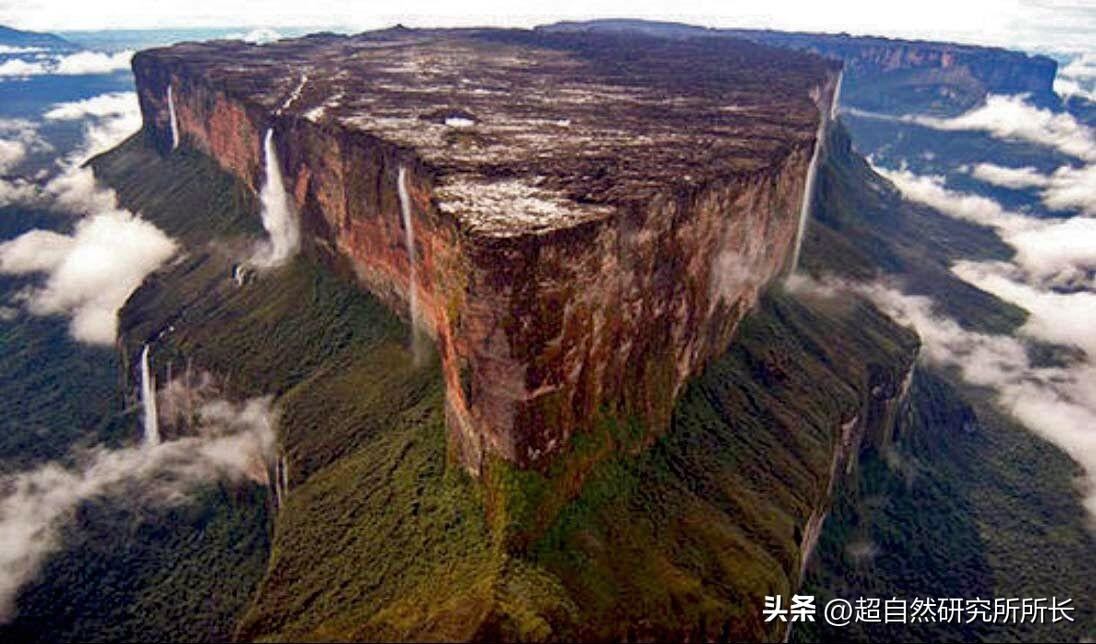 很快,一座比瓦屋山更震撼的神山开始出现在我们面前,不仅有相同的外观,而且比瓦屋山更平更方,简直就像人为修整过一样,它就是罗奈马山,海拔2810米,山顶极其平坦,就像月球的表面,有池,有很多坑洞,还遍布着大量的水晶、钻石、铝土矿藏以及远古恐龙的化石群,再次验证山海经中记载的“顶上有池,面有九井、和昆仑多金”的说法;