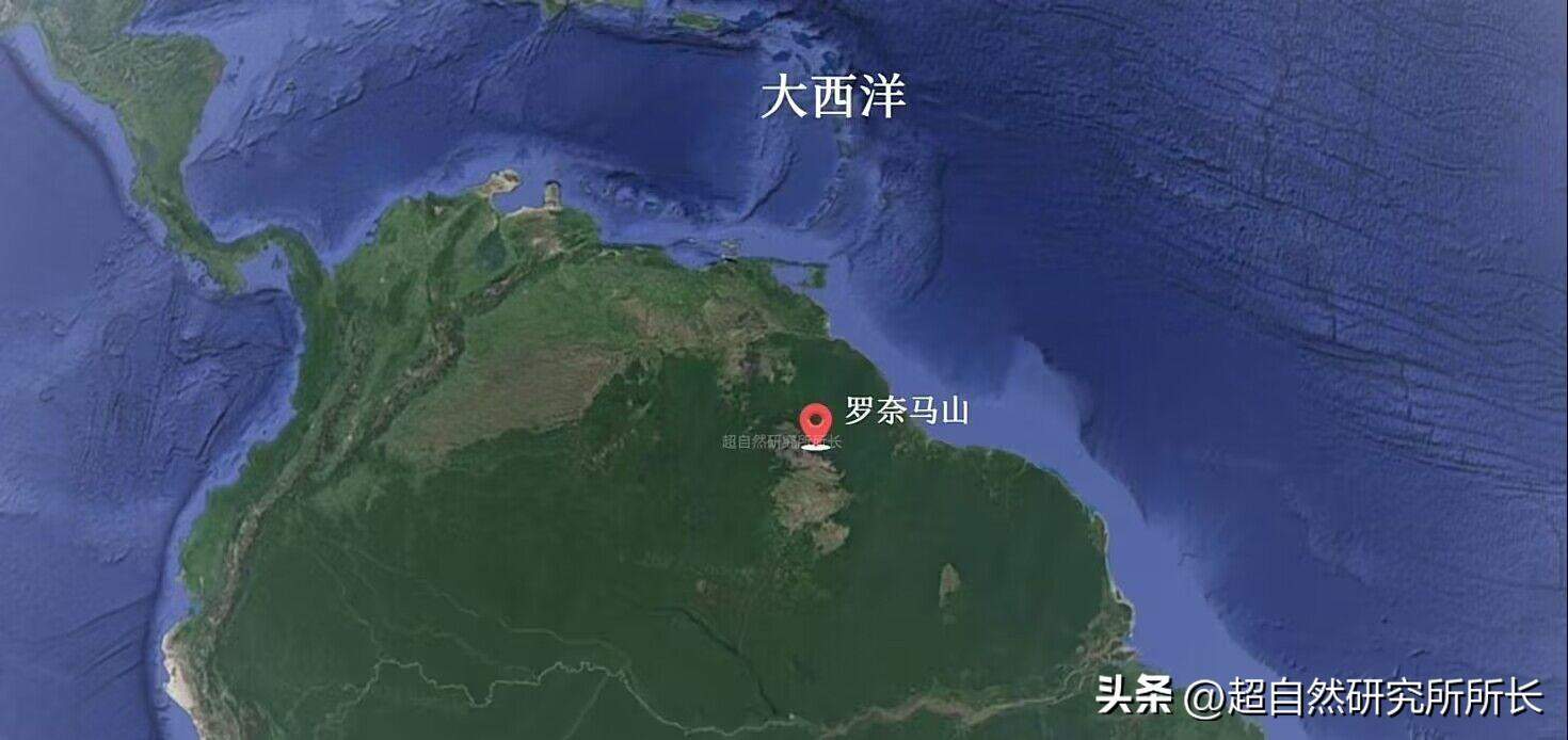 真相已逐渐明了,但还有个更关键的线索等待我们去验证,那就是罗奈马山的周边到底有没有山海经中记载的这些地点?《山海经大荒西经》中记载,昆仑在“西海之南,流沙之滨,赤水之后,黑水之前,有大山,名曰昆仑之丘,其下有弱水之渊环之,其外有炎火之山,此山万物尽有。”让我们调至卫星页面,这里是就是大西洋,而罗奈马山又正好处于大西洋的正南方,正可谓西海之南;