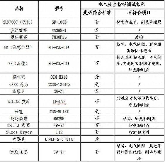 本次比较试验,采取实验室检测电气安全指标和性能指标的方式对样品进行综合测试评定。一是电气安全指标检测10个项目。二是性能指标检测“除湿性能”1个项目,采用自定义的方法测试样品烘干除湿效果。