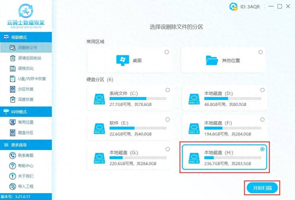 然后选择要恢复的文件位置,选择好误删除png文件所在位置后,点击右下角“开始扫描”。
