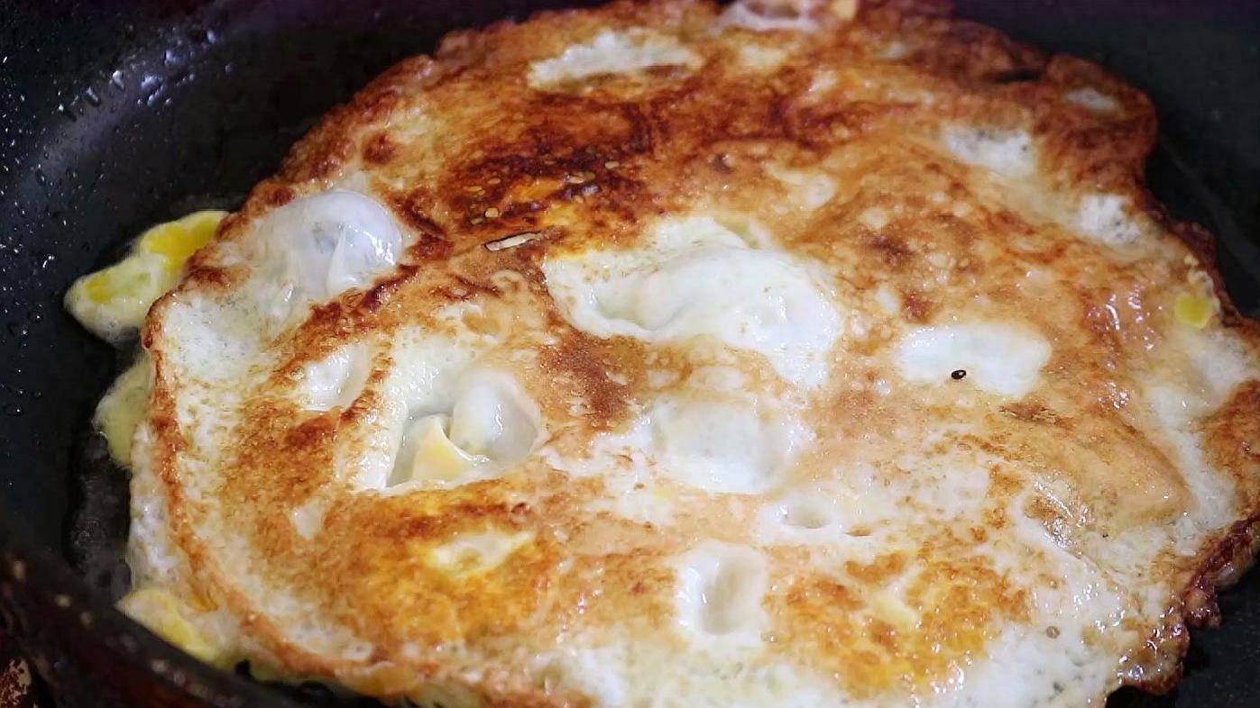 4、把准备好的三个鸡蛋拿出来,打到一个干净的空碗中,不用搅散,直接放到一旁备用。取来平底锅先烧热,然后倒上食用油,油热之后放入鸡蛋,用小火慢慢煎,煎至底面定型,然后咱们用铲子把鸡蛋黄稍微搅一下搅散。底面煎黄后翻一下面继续煎,两面都煎熟之后就可以出锅了。