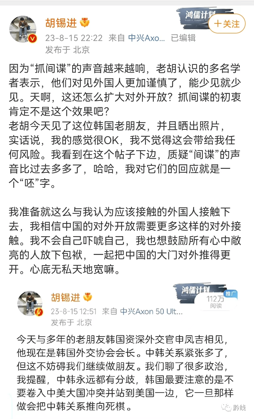 老胡在帖子一开始就直奔主题:因为“抓间谍”的声音越来越响,老胡认识的多名学者表示,他们对见外国人更加谨慎了,能少见就少见。天啊,这还怎么扩大对外开放?抓间谍的初衷肯定不是这个效果吧?