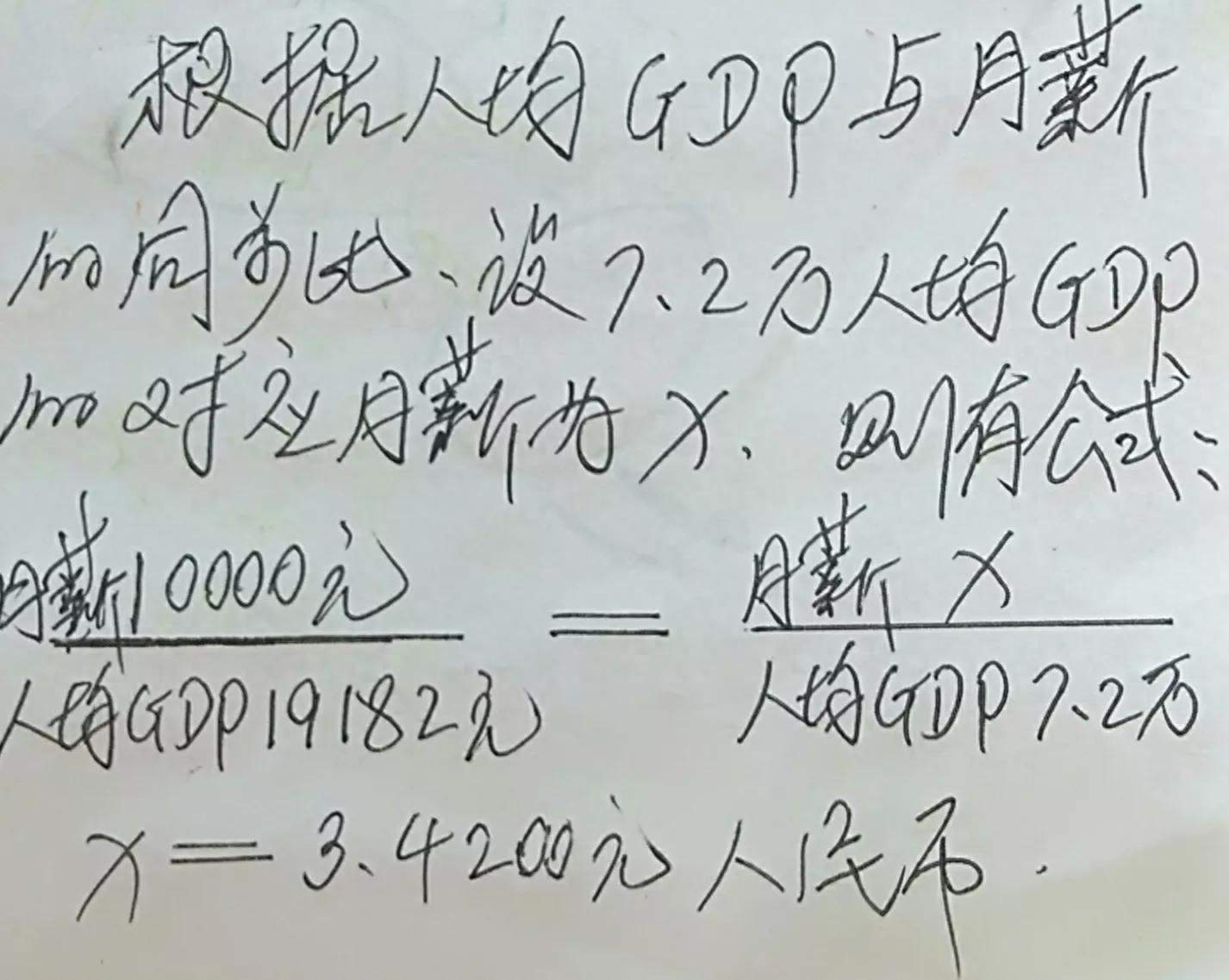 根据人均GDP与工资同步,可以设置与在越南月薪1万人民币的中国月薪为x,也就有了1万/19182元=x/7.2万元这个计算公式,最后计算的结果ⅹ(在中国的白领月薪)在34000多元~34200元之间。说明在中国一个公司白领能拿到34200元的月薪,其地位才与越南人在越南拿月薪1万人民币的地位相当。