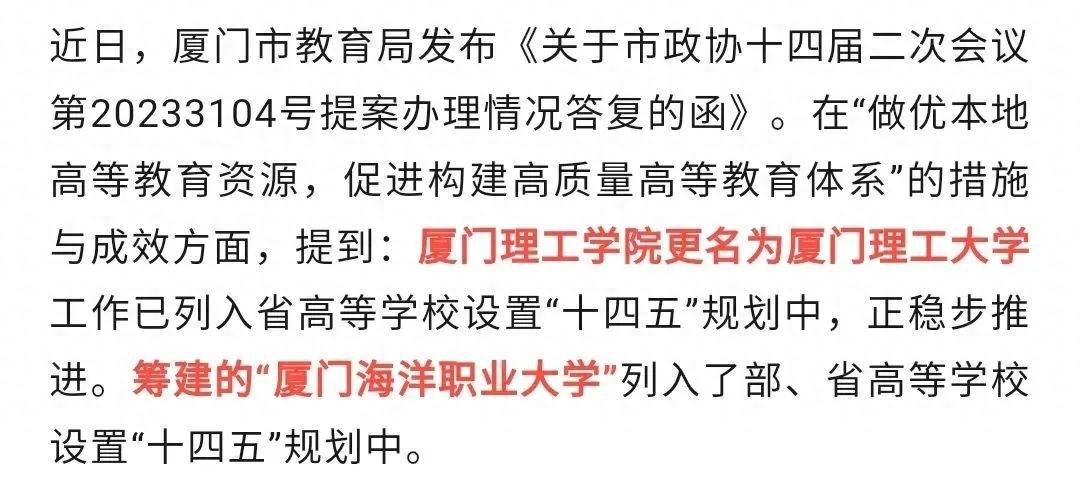 2023年1月份,厦门教育局在回答网友提问时,再次表示将推进厦门海洋职业技术学院升格厦门海洋工程大学(暂定名)。这也意味着厦门,仍然在努力将这所高职院校,升格为普通本科院校。