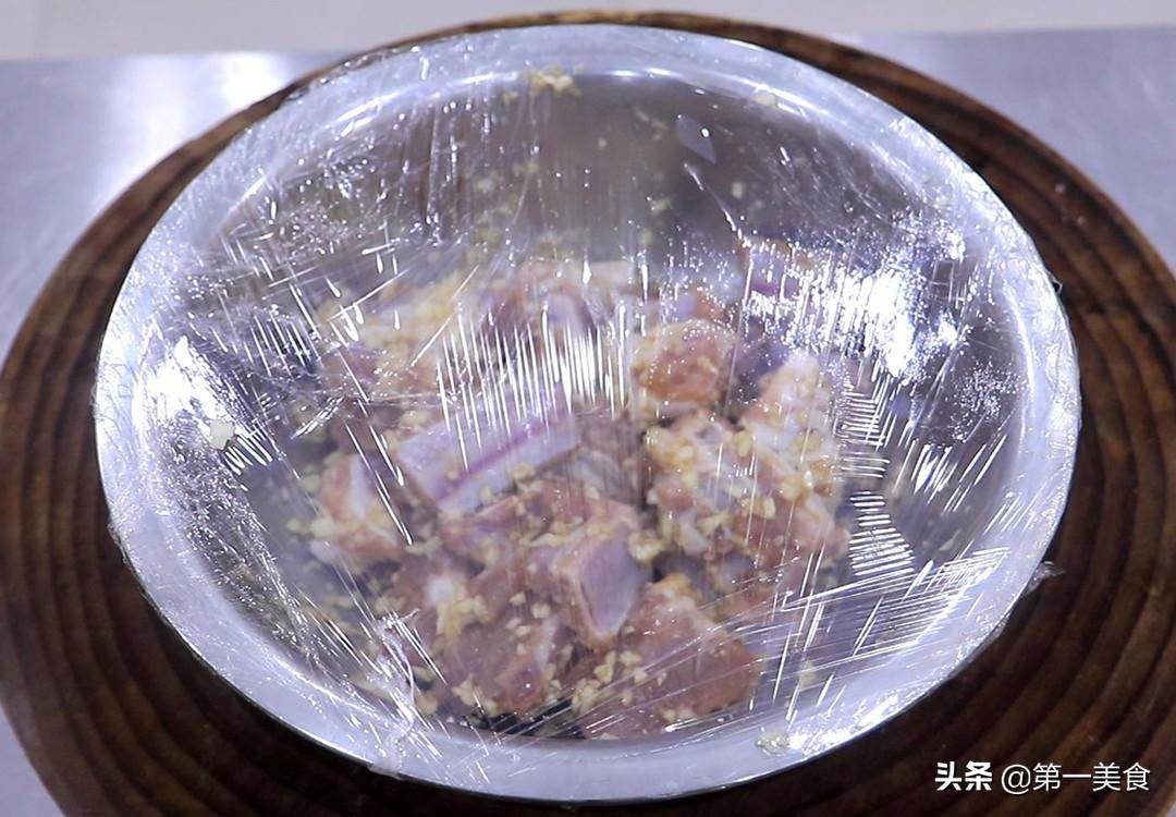 再加入一勺食盐,一勺鸡粉,倒入蚝油10克增鲜,料酒10克去腥,抓匀以后,用保鲜膜盖住,密封腌制2个小时以上,让排骨充分吸收料汁入味。