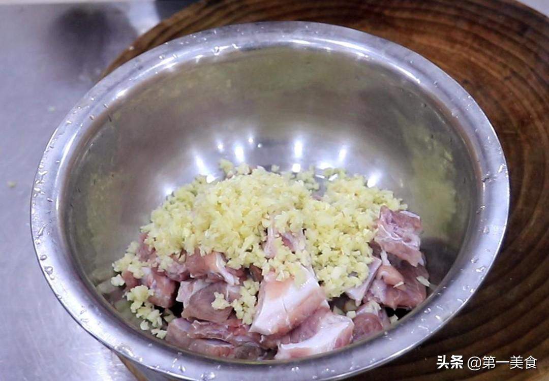 准备排骨一块,先把排骨剔开,再剁成均匀的小块,剁好之后放入清水中,反复抓洗几遍,把里面的血水洗干净。