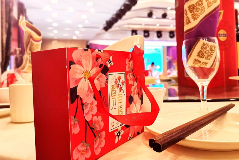 吃完宴席,宾客们纷纷要离开,这时服务员又给每位客人发一个小袋子,原来是夫妻俩精心给大家准备的伴手礼。小杨拆开袋子看见两盒
