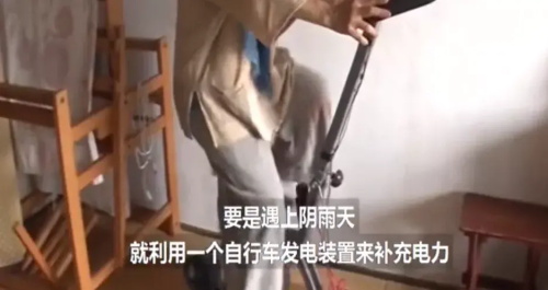 她的生活用电来源很简单。女子买了一块太阳板,天气好放在外面就可以储存一天的电量,天气不好的时候,她就在书房里用脚踩自行车发电。