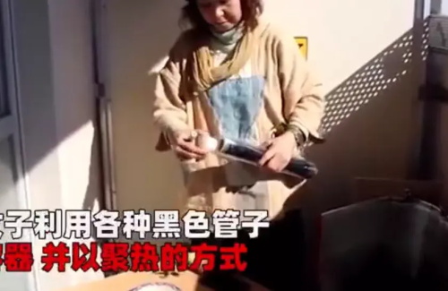 她在家煮饭的时候,也不用什么锅具。只利用几根黑管子容器,在阳光底下进行聚热,经过长时间放置后料理就可以做好了。