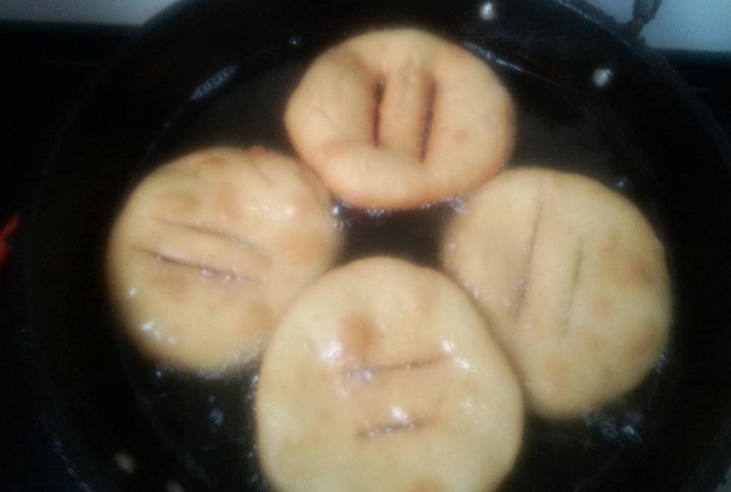 7.六成热下面饼,不要着急,一定要小火炸,一面上色,翻面。炸至金黄捞出沥油。