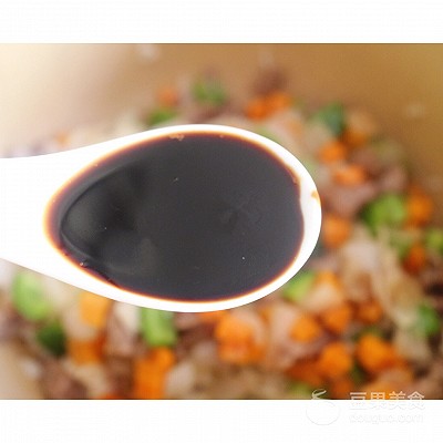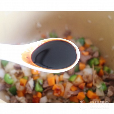7、把炒好的牛肉蔬菜丁加入电饭煲,加一汤匙生抽,