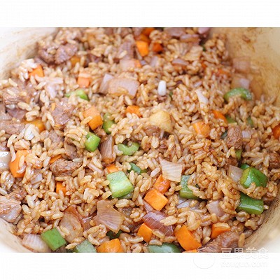 牛肉 150g 胡萝卜 1/4个 洋葱 半个 青肉椒 半个 生抽 1汤匙 老抽 1汤匙 盐 适量 大米 一量杯 清水 适量 植物油 适量