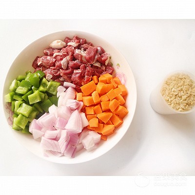 1、准备好食材,牛肉,胡萝卜,青椒,洋葱全部切丁备用,