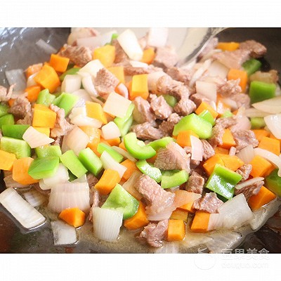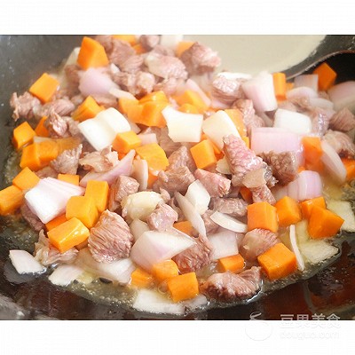 4、炒至牛肉变色后,下入胡萝卜,洋葱丁,炒至稍软,