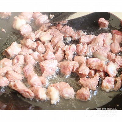 3、煮饭的时间,我们来炒肉,炒锅放入适量植物油,油热后下入牛肉翻炒,