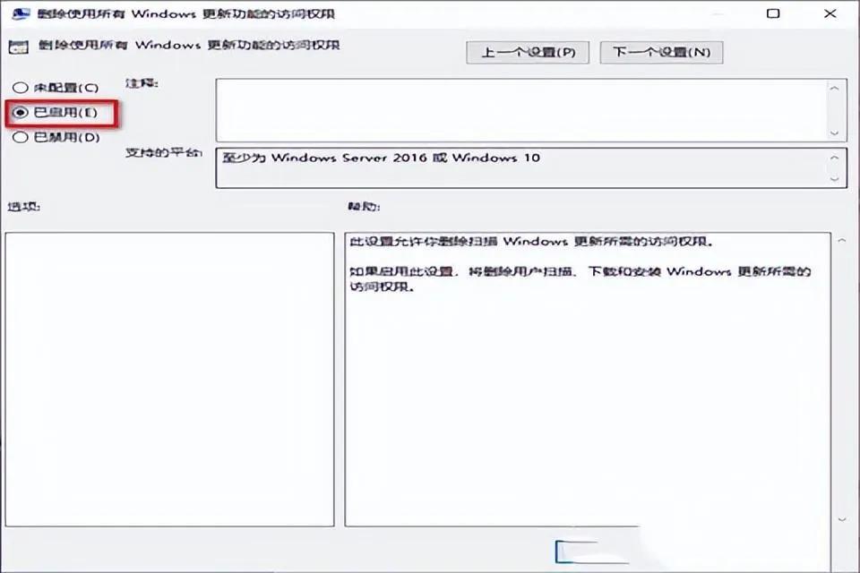4、最后还回到那个界面找到“删除使用所有Windows更新功能的访问权限”,选择已启用。