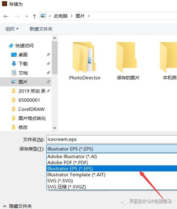 第二步,在储存为对话框中选择保存类型为Illustrator EPS,这一点很重要。然后修改文件名并点击保存按钮。这时我们保存的就不是ai文件,而是eps文件。