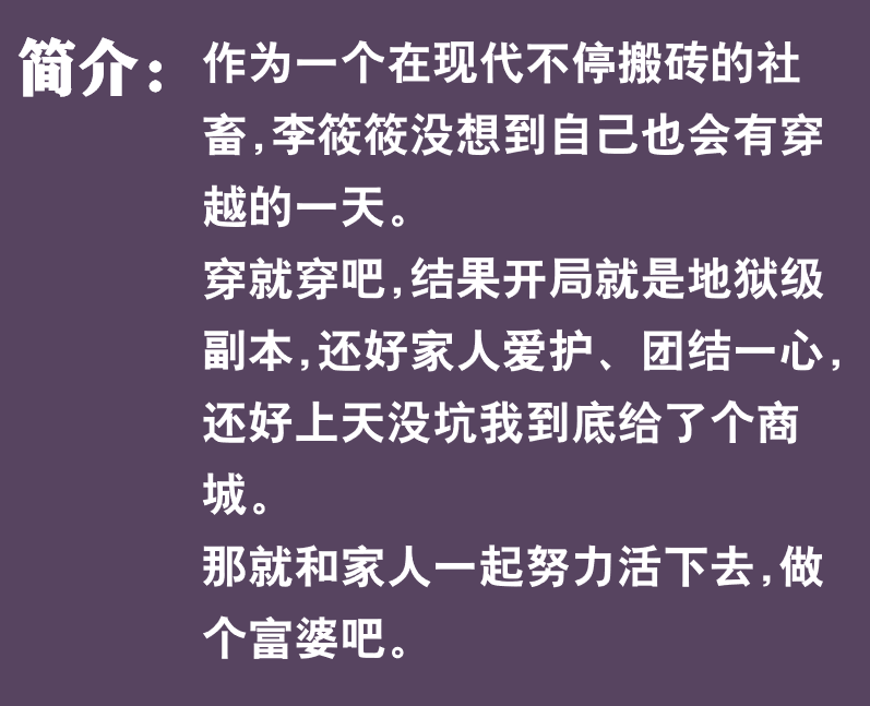 点评:本文无cp,没有和那些将军皇子什么的谈恋爱。因为商城是位面商城,所以多少会涉及到其他世界东西,但女主不会修仙也不会有异能啥的。