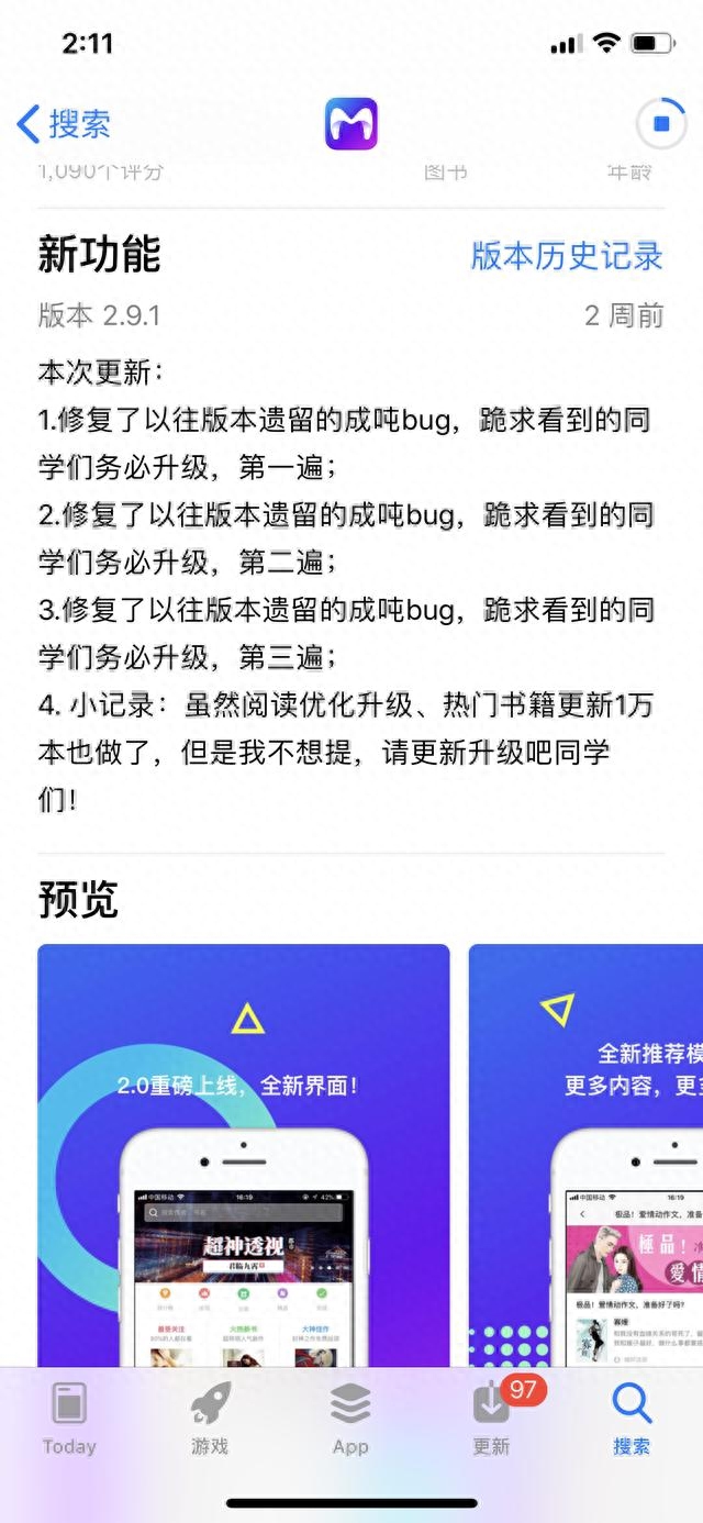 看了一下他们更新版本,修复了成吨的bug,如果能够把广告减减肥,好评率应该会提高不少。