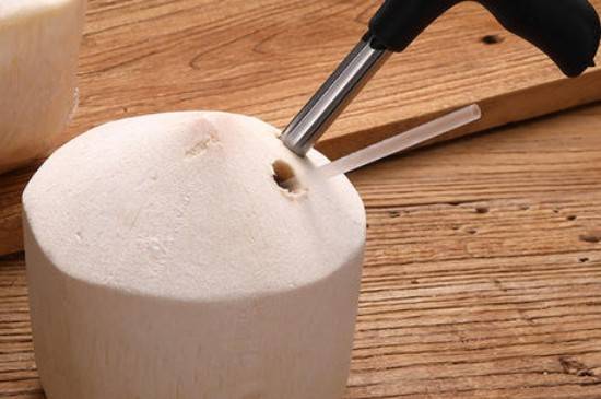 如果始终找不到椰青的三个孔,也可以直接将尖尖的一面切开,在切的过程中需要小心,避免切到手了,也可以用专用的开椰器,钻好孔之后,就可以用吸管开喝了,千万不要将椰青直接切开,不然当中的椰汁全部会流失。
