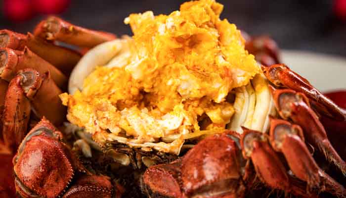 2、螃蟹在饱食过后,胃部胀起,蒸熟后像黑色胶状,好像蟹黄发黑,这种螃蟹直接用手摘除黑色胶状的物质之后即可正常食用。