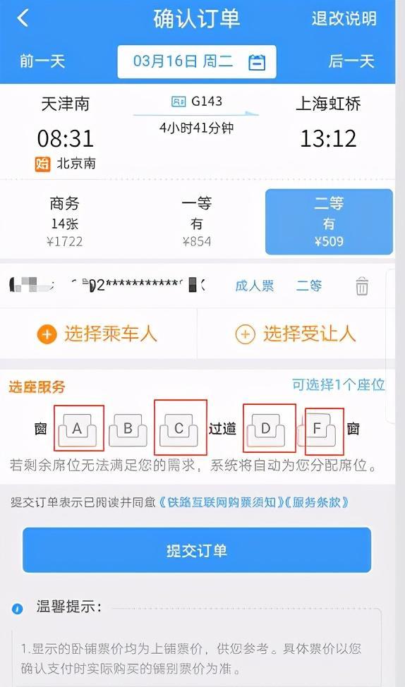 以从天津南站—上海虹桥高铁为例,看看我们网上订票时如何选座。