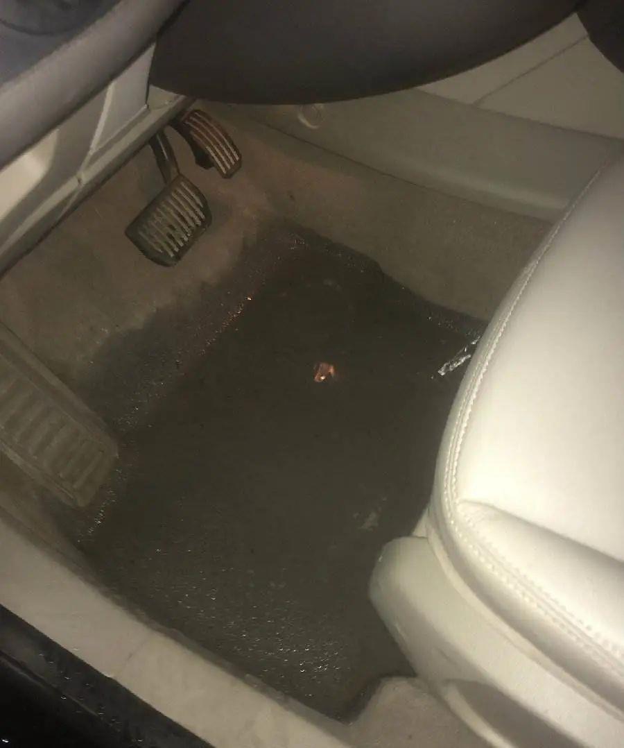 同时蓄水槽垃圾堵塞排水口导致排水不畅,最终雨水倒灌入车内,造成地毯积水、内饰水渍,最严重的可能会让线束和车身的腐蚀。