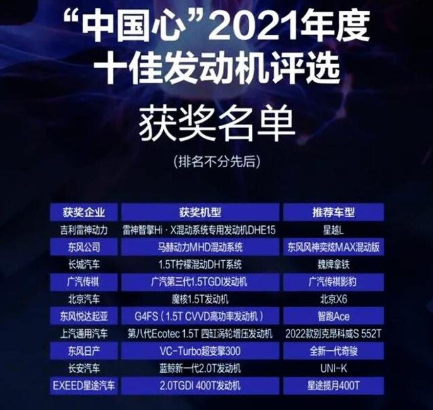 今年的沃德十佳发动机评选早就出炉了,大部分是混合动力,而且都是国外品牌,就跳过了。而月初,咱们自己的“中国心”2021十佳发动机评选结果也出来了,这就看看这榜单含金量如何。