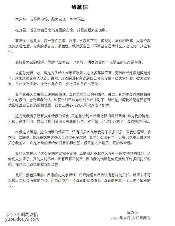 昨日,斗鱼知名游戏主播周淑怡正式在平台公开了自己的道歉信,官宣自己恢复单身!