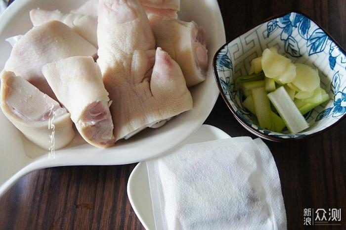 做法:猪手用冷水浸泡后清洗干净,大葱和姜去皮洗净切段、切片,准备一包卤料包,没有现成的卤料包也可以直接加调味料。