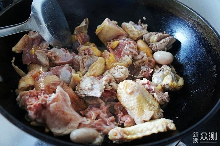 自家养的小笨鸡,宰杀后,注意摘净所有的毛根,清洗干净,根据自己的喜好斩成大小合适的块儿,冷水浸泡出血水,大约浸泡1小时左右,然后洗净控净水分。炒锅加热,下入控净水分的鸡块,中小火翻炒,炒至鸡块无水分为止,这样炖出来的小鸡特别香,无需焯水。