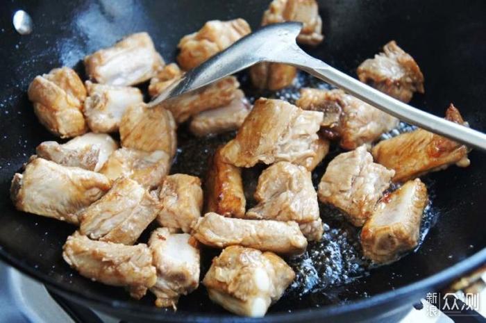 起油锅加入白糖炒糖色,加入葱姜、花椒大料翻炒,加入料酒、老抽、生抽翻炒均匀。加入适量的开水末过排骨略多一些,大火烧开,中火炖至排骨熟。