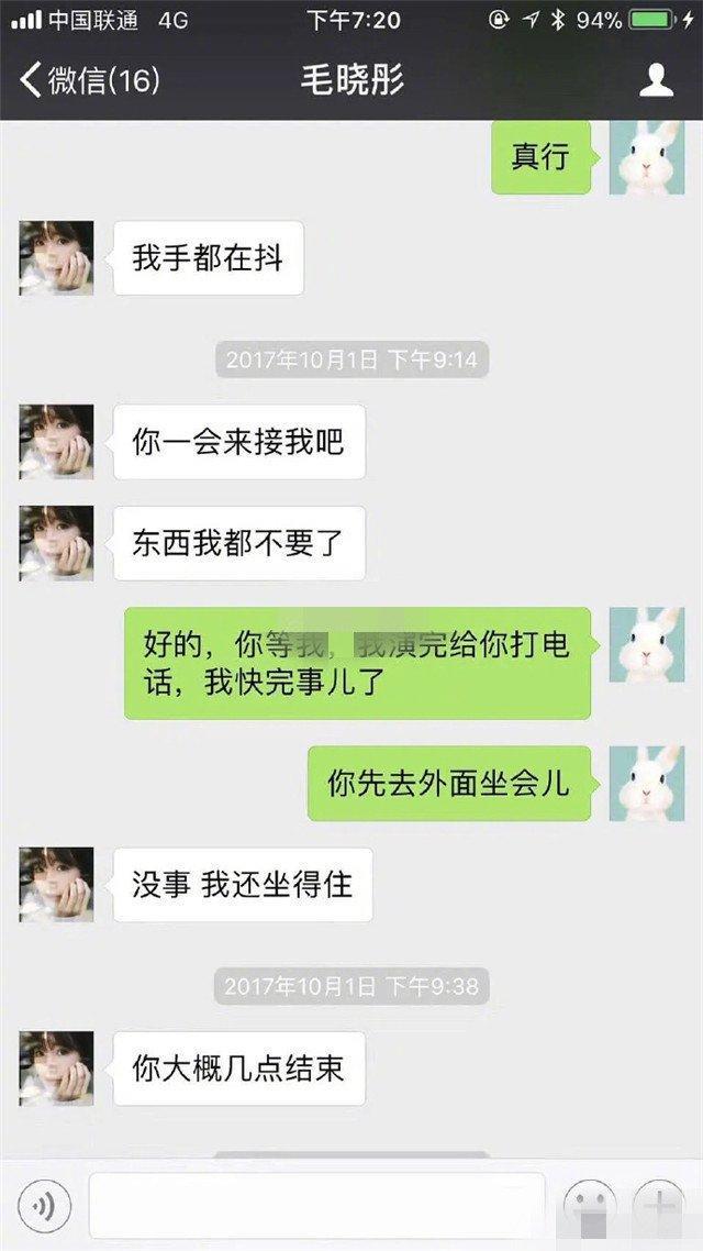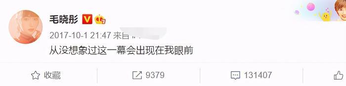 当天晚上9点,毛晓彤微博上发了这么一句话:“从未想象过这一幕会出现在我眼前”。