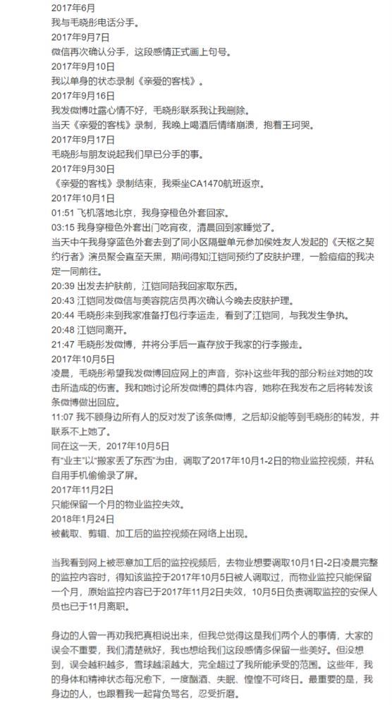 四是说当年全是误会,一切都是因为一场皮肤护理,2017年10月1日晚上约江铠同是去做皮肤护理(挤痘痘),回家拿东西被毛晓彤撞见,并发生争执。