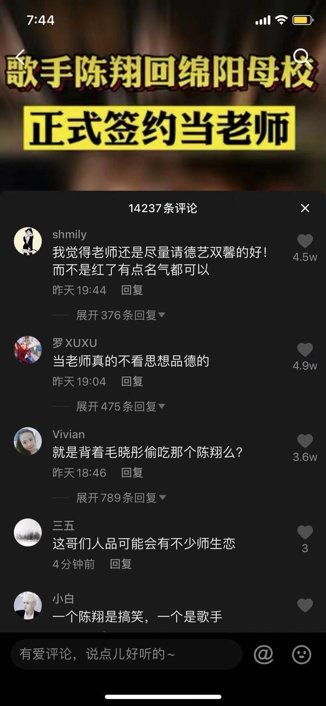 1月7日,网上曝光了一段歌手陈翔回母校四川文化艺术学院,正式签约当老师的视频,陈翔将在合约期内不定期到学校授课。网友评论提到老师是不是要德艺双馨的好!