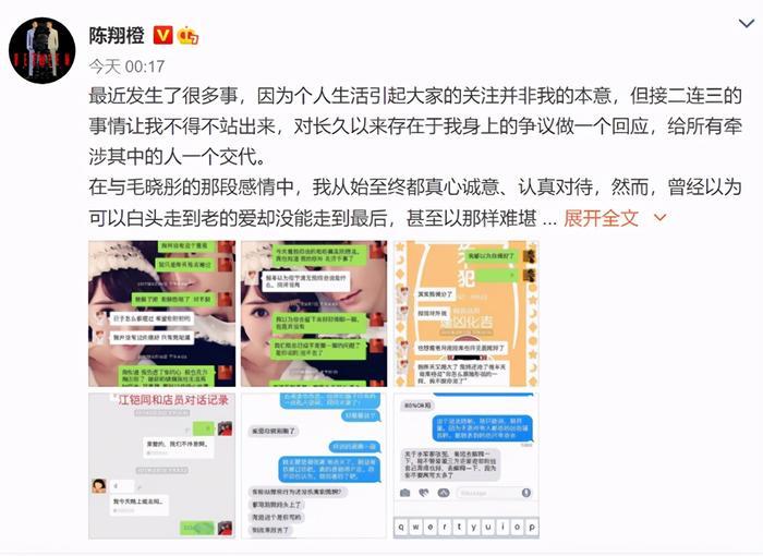 可是时光飞逝,陈翔回首昨天,忽然好像一下恢复了所有记忆,2021年1月30日,他发长文回应新恋情,否认当年与毛晓彤交往时出轨,称两人2017年6月电话分手、9月确认分手,2017年10月1日和江铠同是约了一起做皮肤护理。