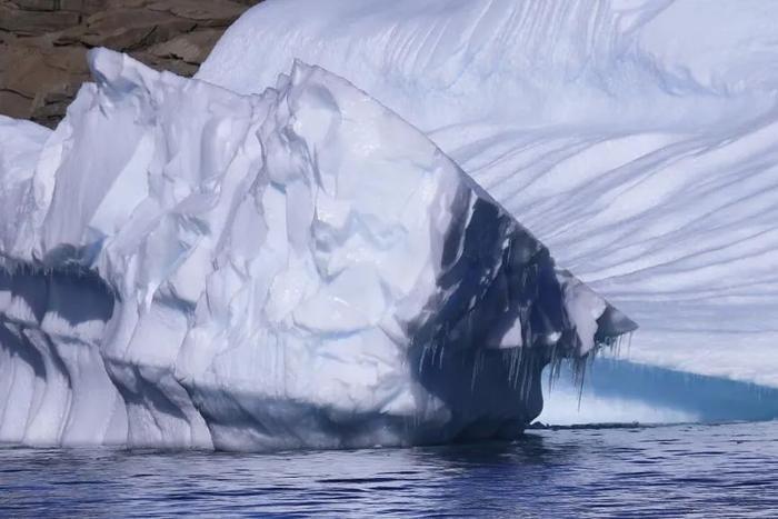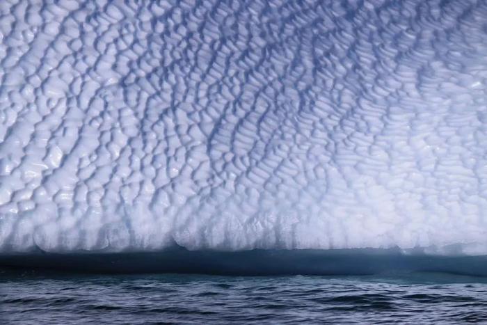 在社交媒体上,肥鹅分享了一组摄影作品,名为“冰川的肌理”。漫长的时光里,碎块于冰山脱落,落在海洋中。经过风吹日晒,以及海浪的剥蚀,便雕琢出不同走向的纹路。“我们会坐着皮划艇,在冰川之间穿梭,距离可能只有一米。肉眼看非常壮观,那一刻会让人非常敬畏自然。”