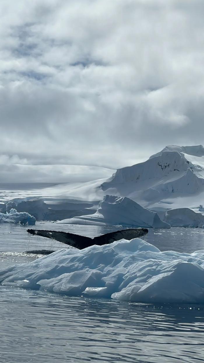 杨冰还记得,在一个天气晴好的午后,邮轮甲板上开放了烧烤。“这时,船长开始提醒,我们的六点钟方向有鲸鱼,接着,两点钟和十二点方向也出现了,”杨冰回忆,“最后船长说,我们被鲸鱼包围了,所以决定停船。请大家到甲板上,尽情享受这个时刻。”此时,所有人就聚在甲板上,欣赏鲸鱼摆尾,为鲸鱼的每一次摆尾阵阵欢呼。晴空之下,南极的海面会泛着金色的波光。对杨冰来说,这样的画面也成了她南极旅行中的金色时刻。