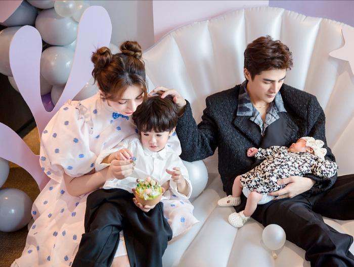 照片中,麦迪娜穿着一件宽松、舒适的白色印花长裙,一脸疼爱的看着怀中刚刚满月的女儿艾米丽。偎依在她身旁的姜潮,则穿着一套黑色的休闲西装,与麦迪娜的目光一同落在女儿艾米丽的身上。而两人的儿子姜丹尼尔,则穿着白衬衫、黑西裤,手中拿着个白色的气球,一脸天真的在逗妹妹玩,整个画面充满了家庭的温馨和生活的幸福。