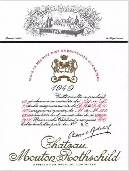 1946年的酒标设计者让·雨果(Jean Hugo1894—1985)是法国大文豪维克托·雨果的曾孙,早年迷恋舞台设计,1921年因为给让·科克托的《游埃菲尔塔的玛丽们》一剧设计而成名,遂为法兰西剧院担任舞美设计。他也绘制油画及水彩,是公认的微型肖像大师。他在两次世界大战期间以设计面具及奇装异服而著称于巴黎各团体,菲利普男爵由此发现了他的才华。让·雨果设计的酒标采用了圣经中大洪水的故事:鸽子衔着橄榄叶返回方舟,象征着战后第一个和平年。