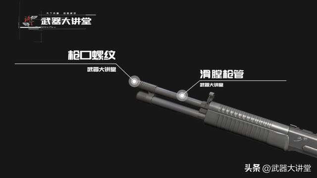 在枪机上设计有两个大型闭锁突耳,这样设计一方面是因为霰弹的口径装药量都比较大,更大的尺寸能带来更好的枪机强度,但是也比较方便加工生产。