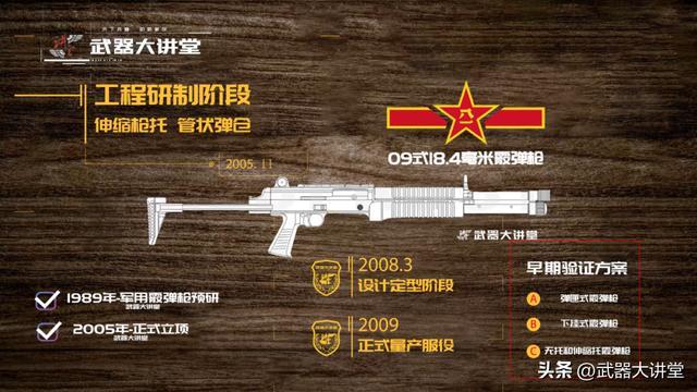 或许是意识到这个空白,于是在1989年军用霰弹枪的预研工作基础之上,于2005年正式成立项目小组研制新一代军用霰弹枪的工作,早期的预研制工作论证了弹匣式霰弹枪、下挂式霰弹枪、无托霰弹枪和伸缩托霰弹枪等多个方案,并且解决了弹药研制核心技术等多项问题。
