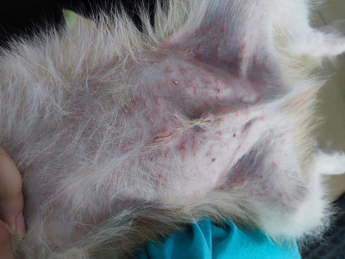 2:患部剪毛后在皮肤上涂肤轻松或皮炎平软膏。防止皮肤感染,也可与红霉素软膏交替涂抹。