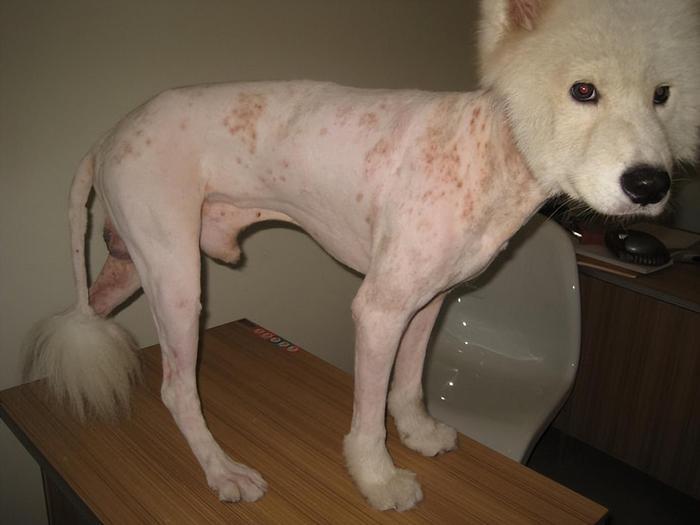 4:狗的背部或四肢皮肤增厚、脱屑、色素沉着、被毛粗硬、逆立、瘙痒加剧,病情反复发作,有时拖延几年。