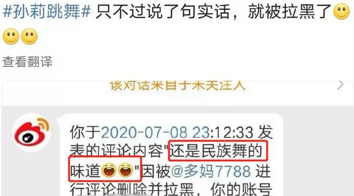 我寻思着,网友也没有骂她,说她跳得不好啊。只是客观地说了一句像民族舞,何至于拉黑呢,搞得好像民族舞有啥见不得人一样。我就说了一句:“民族舞功底很扎实”,而且我还粉她好多年,被无情拉黑禁言,我整个人都懵了。太玻璃心了吧,人家又没有恶意,你至于删评拉黑吗?