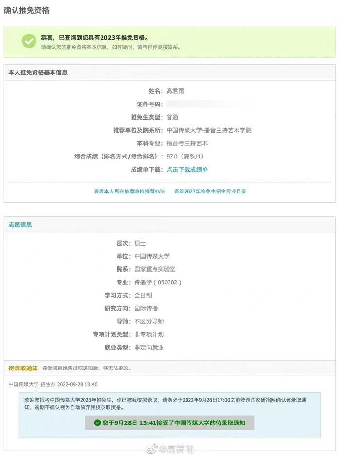 2019年6月底,高君雨以总分568分,超过本科线113分,考上了梦想的大学--中国传媒大学,成为央视主持人康辉、尼格买提等人的学妹。