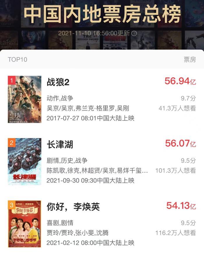 它的票房已经突破56亿,暂列中国内地票房总榜第二。