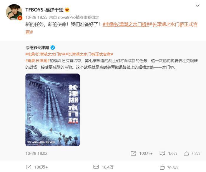 虽然续集官宣了,《长津湖》也仍旧在发力。