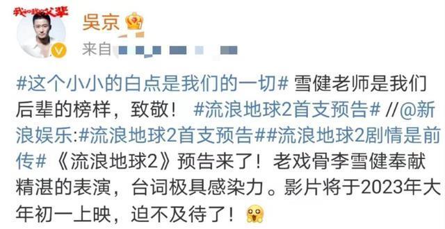 浏览吴京的动态,可以看到他现在正忙于电影制作,新片《流浪地球2》也将在2023年大年初一上映。吴京凭借着精湛的演技,对电影竭尽全力付出的行为深受大家的喜爱,想必他的新作也会有很好的反响。