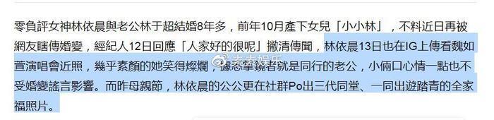 至于林依晨为什么没有转发一家人的照片分享出来,可能她都懒得理每年都传出离婚的这一种谣言吧。